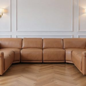 Take your relaxation to the next level with this super soft and comfortable camel italian leather modular l shaped six piece corner sectional with console. The high-end premium leather used makes your lounging luxuriously comfortable and adds an elegant appeal to your space. Solid colors give you lots of decorative options and are easy to work into your decor scheme. Flared_arms offer a comfy place to rest. For the ultimate in relaxation, this sectional includes power – push button recline that turns it into a comfy lounge for sleeping or resting. Add sleeping options to your space as this fabulous sectional opens to a n/a sleeper. Silver metal legs effortlessly elevate the room and add a touch of contemporary design. Great for everyday lounging and for entertaining, sectionals are an ideal way to seat multiple people. 39-inch h x 110-inch w x 123-inch d.