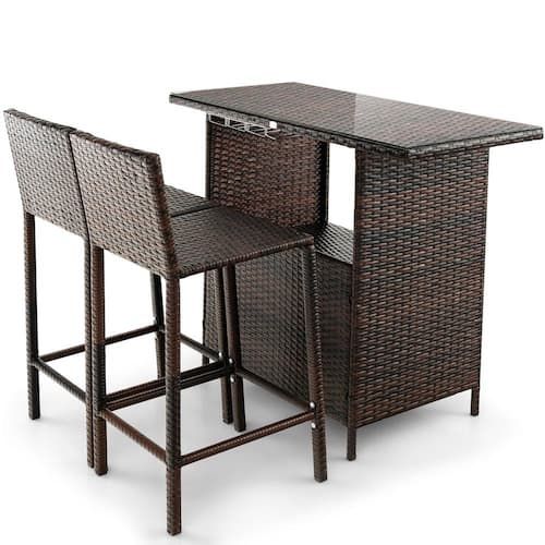 Costway 3-Piece Wicker Outdoor Serving Bar Set Height Table 2-Stools with 3-Rows Stemware Racks Garden