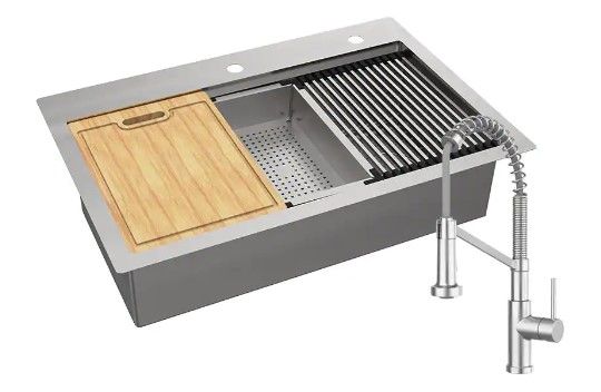 This double ledge workstation sink forged from 18-Gauge Type 304 corrosion resistant stainless steel includes sliding accessories for multi-tasking and additional counter-top space. Slide the colander next to the cutting board and easily spray off fruits and veggies before or after cutting. The spring neck faucet can enhance your kitchen with the industrial look of this single-handle kitchen faucet. Equipped with practical accessories to decrease food prep time and a bottom grid to protect the bottom surface and prevent scratching. The workstation sink comes in a standard 33 in. by 22 in. size for most existing cut-out. If you enjoy cooking like a professional chef, then this is the sink for you.