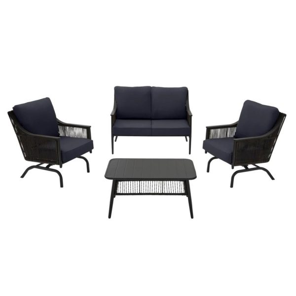 Hampton Bay Bayhurst 4 pc Black Wicker Outdoor Patio Conversation Seating Set w/ CushionGuard Midnight Navy Blue Cushions