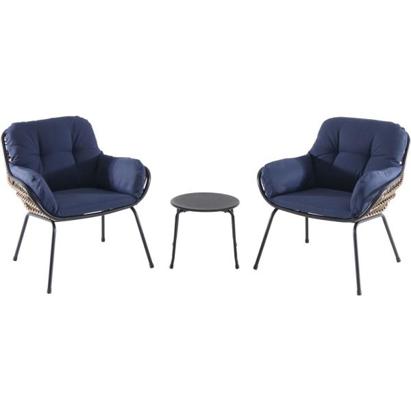 Create a cozy backyard getaway with the Naya 3-piece chat set. Perfect for small environments and unused corner areas, this contemporary chat set can transform any environment into an attractive conversation space. This space-saving chat group includes 2 accent chairs, complete with 4-sided cushions and a The unique, open-weave design will draw you in for a closer look and once you take a seat, you’re suddenly immersed in comfort as the extra-plush cushions cradle you from 4-sides. The 22 in. round side table is a convenient place to rest beverages and snacks. Just under 14 in. tall, this table is designed with the same steel frame and matte black finish as the chairs. If you’re looking to make a statement in your outdoor space, choose the Naya Collection for a fresh, modern take on backyard-chic furniture.n3-piece chat set from the Naya collectionnSet includes 2-accent chairs and a 22 in. end tablenPerfect for small environments and unused corner spacesnMade with durable materials that are built to last outdoorsnUnique open-weave design over black steel framesnHigh-performance powder coating provides extended protection against rust, scratches and UV harmnSlim, metal legs add a touch of industrial style to the looknNon-skid feet prevent unintentional movementnPlush cushions provided for each chairnLow-maintenance and easy to cleannCushion color: navy bluenSome assembly requiredn1-year limited warrantyn.nCalifornia residentsnsee Prop 65 WARNINGS
