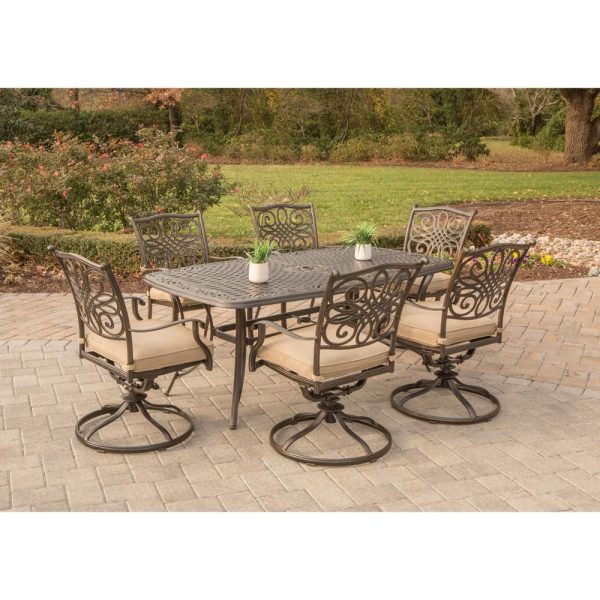 Hanover Traditions 7 pc Aluminum Outdoor Dining Set w/ 6 Swivel Dining Chairs and Natural Oat Cushions