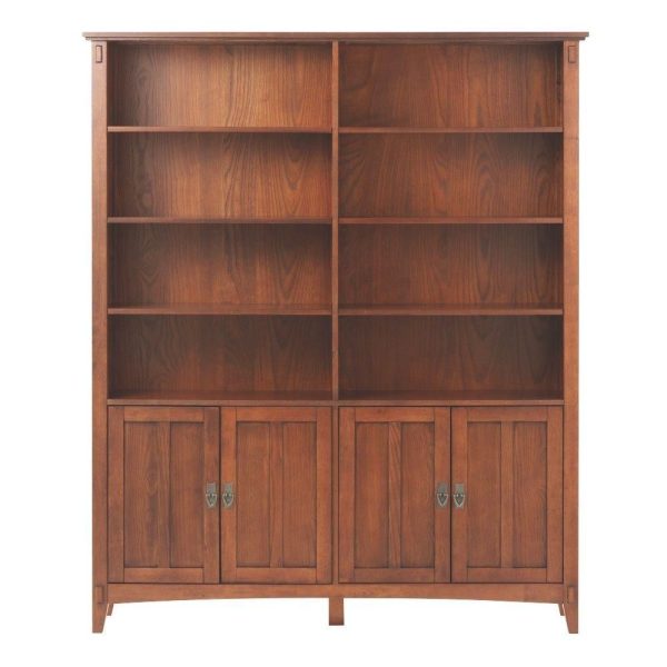 Our Artisan Double Bookcase with Doors is divided down the middle into 2-separate bookcases. Each 4-shelf bookcase features 2-adjustable shelves to suit your storage and display needs. Below, 2-double-door cabinets hide away even more items. With stepped top molding, geometric door panels, a curved toe kick and tapered feet, this lovely piece of Arts and Crafts-style furniture makes a striking impression