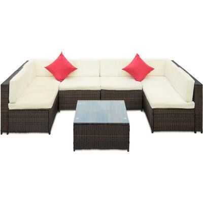 maocao hoom Brown 7-Piece Wicker Outdoor Sectional Set Patio PE Rattan Furniture Set w/ Beige Cushions