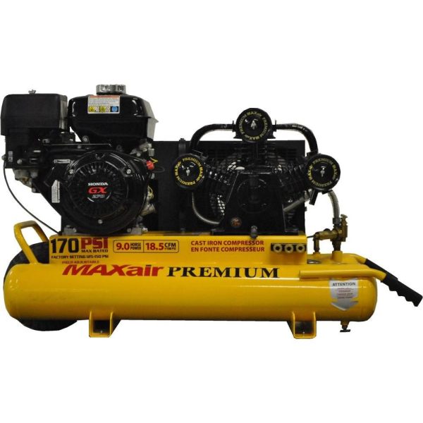 The Maxair Premium Industrial 9.0 HP GX270 Honda engine, electric start, 10-Gal. portable Wheelbarrow style tank, Air Compressor comes with a High Flow 3 Piston V Style Cast Iron Pump for Market Leading 18.5CFM at 100 PSI (170 PSI max) Out-put, High Efficiency Reed Valves for longer life.