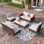 5-piece set contains two (2) armrest benches, one (1) corner chair, one (1) chair, and one (1) table, and beige cushions