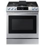The Samsung Front Control Slide-in Gas Range with Smart Dial and Air Fry is fully Wi-Fi connected and voice enabled, giving you the tools you need to simplify the cooking experience in the kitchen.