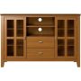 Features two (2) central drawers with metal glides, open center area with adjustable shelf and two (2) side tempered glass framed doors that open to large storage spaces with two (2) shelves each