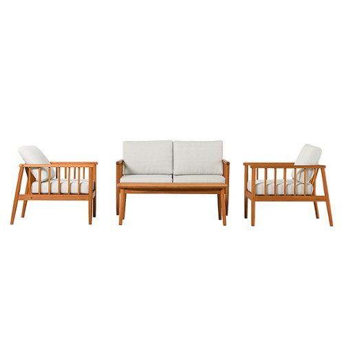 Lay back, lounge, and look forward to total backyard bliss with this patio set on display and ready to accommodate. Low-key comfort and high-key style effortlessly unite with this matching set’s spindle sides and plush cushions. Configure the loveseat and accent chairs however you like to host summer soirees or intimate get-togethers with friends and family—with enough room for everyone! The perfect surface for smore’s assembly, game night, or seasonal cocktails, the included solid wood coffee table is the cherry on top of this essential entertainment hub. Mindfully crafted with solid eucalyptus wood, this set of four is sustainable, stylish, and moisture resistant.