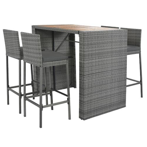 New Gray 5-Piece Wicker Rectangle Bar Height Outdoor Serving Bar Set with Removable Gray Cushion, Wood Table Top