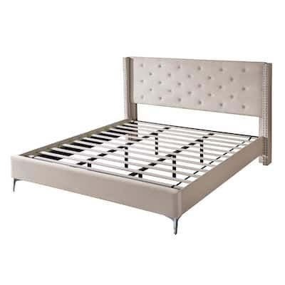Cream Velvet Tufted Queen Bed Frame Beige with Upholstered Headboard No Box Spring Needed