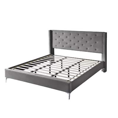 Grey Velvet Tufted Queen Bed Frame with Upholstered Headboard No Box Spring Needed