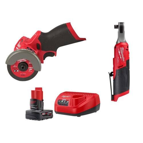 Milwaukee M12 FUEL 12V Lithium-Ion Cordless 3 in. Cut Off Saw with High Speed 3/8 in. Ratchet and XC 4.0Ah Battery Starter Kit