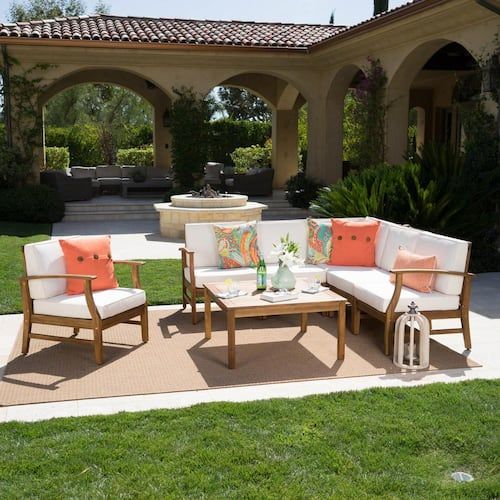 Noble House Malawi Grey 7 pc. Wood Patio Fire Pit Sectional Seating Set w/ White Cushions