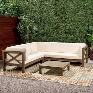 Noble House Brava Grey 5 pc Wood Patio Conversation Sectional Seating Set w/ Beige Cushions