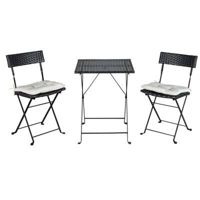 Black Frame 3-Piece PE Wicker Folding Outdoor Bistro Set w/ Table, Chairs and Beige Cushions