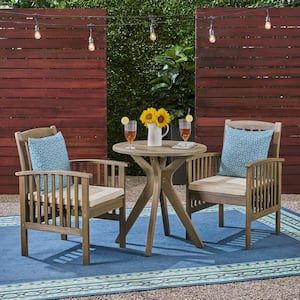 Noble House Casa 30 in. Grey 3-Piece Wood Round Outdoor Bistro Set with Cream Cushions