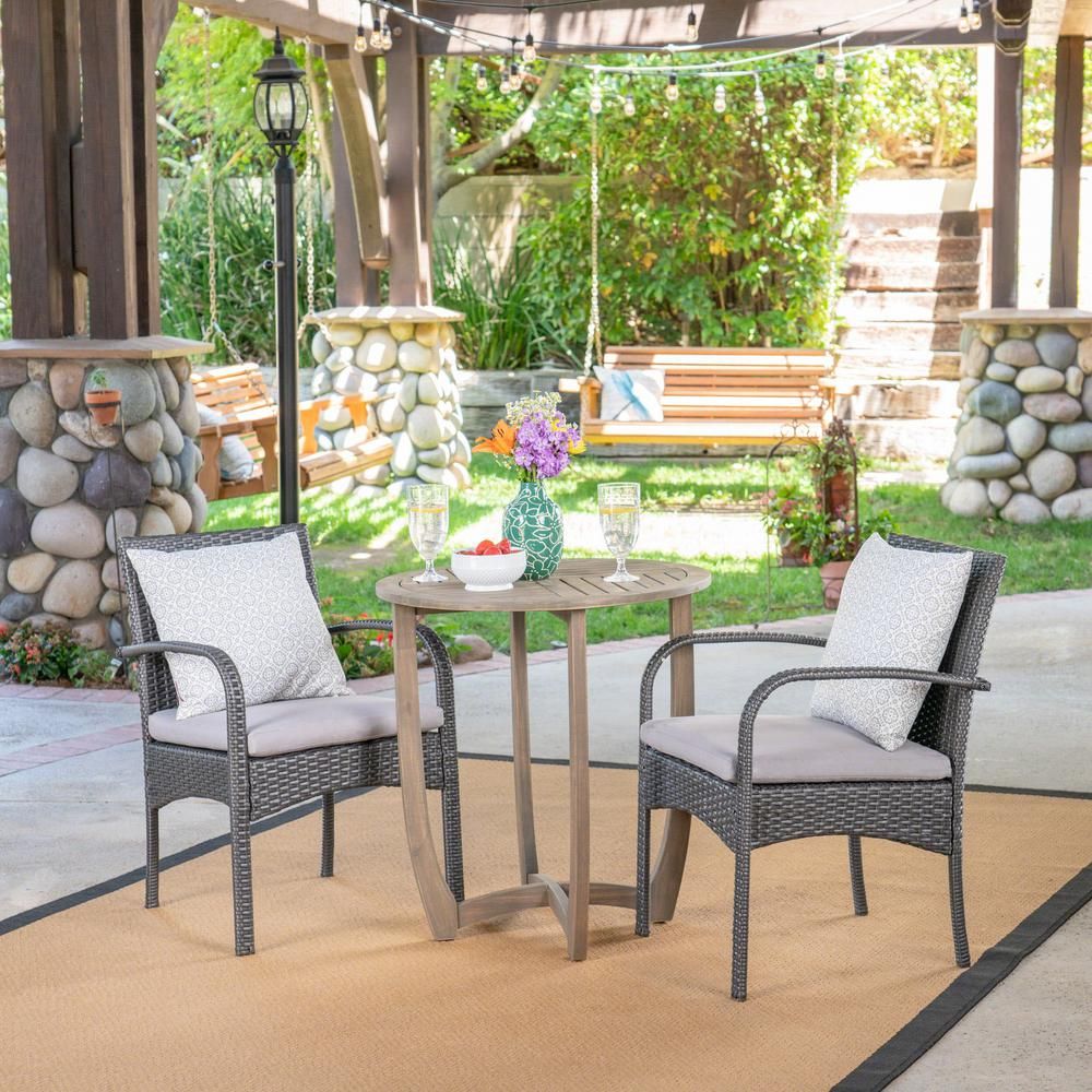 Noble House Lindy Gray 3-pc Wood and Wicker Outdoor Bistro Set w/ Gray Cushions