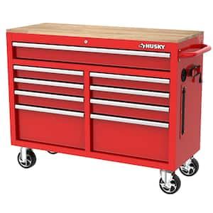 Husky 46 in. W x 18 in. D 9-Drawer Gloss Red Mobile Workbench Cabinet with Solid Wood Top