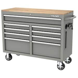 Husky 46 in. W x 18 in. D 9-Drawer Gloss Gray Mobile Workbench Cabinet with Solid Wood Top